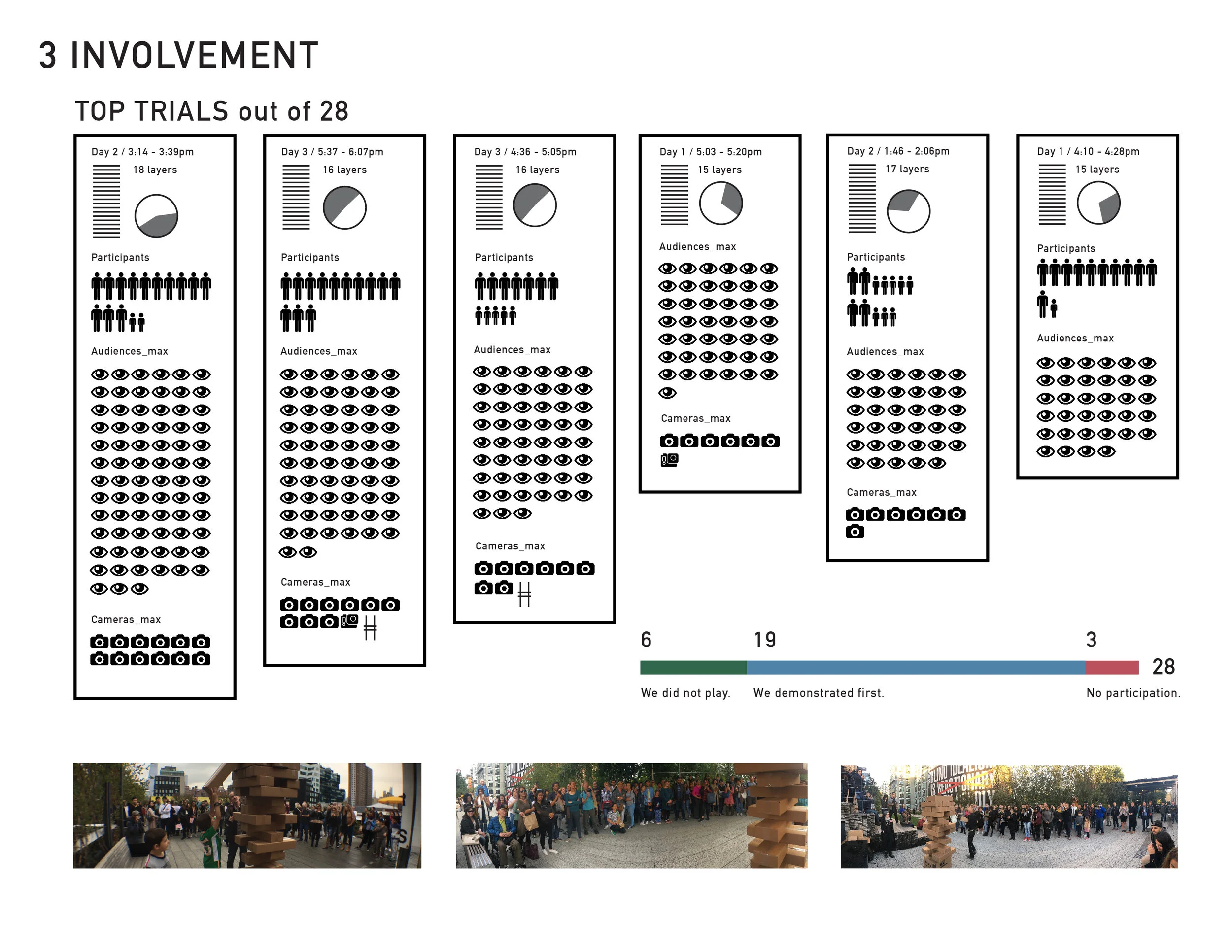 Throughout the experiment, our team used minimum verbal communication. Interaction with the audiences and participants were limited to gestures and eye contact. Using the well-established nature of the game Jenga as an advantage, we were able to engage a large number of passers-by over the course of three days and study the complex behaviors of both the participants and the audiences.
