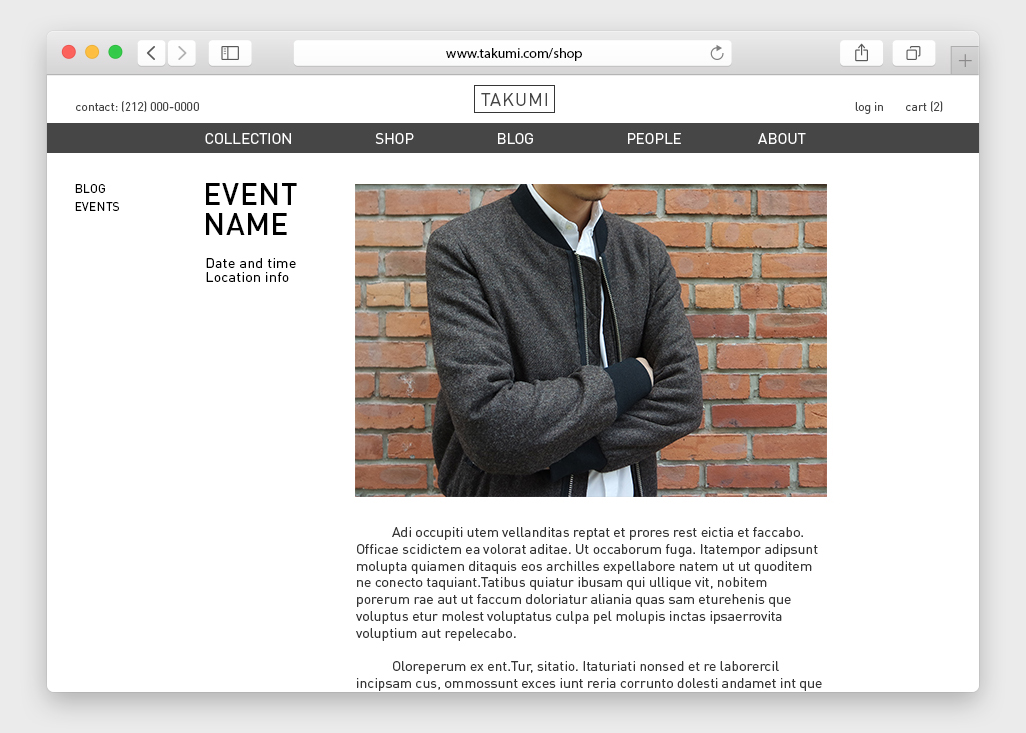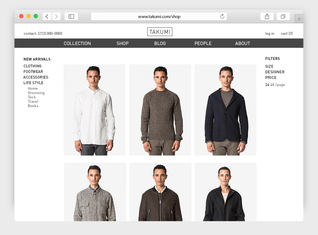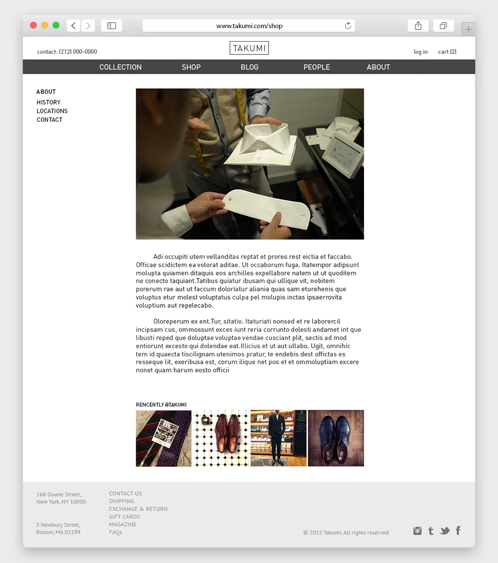 Takumi is a hypothetical buyer’s boutique, which carries sartorial menswear, finely crafted leather goods and accessories. Working closely with Will C., a businessman turned fashion buyer who proposed the establishment of this boutique, I created the brand identity and built a website for Takumi.