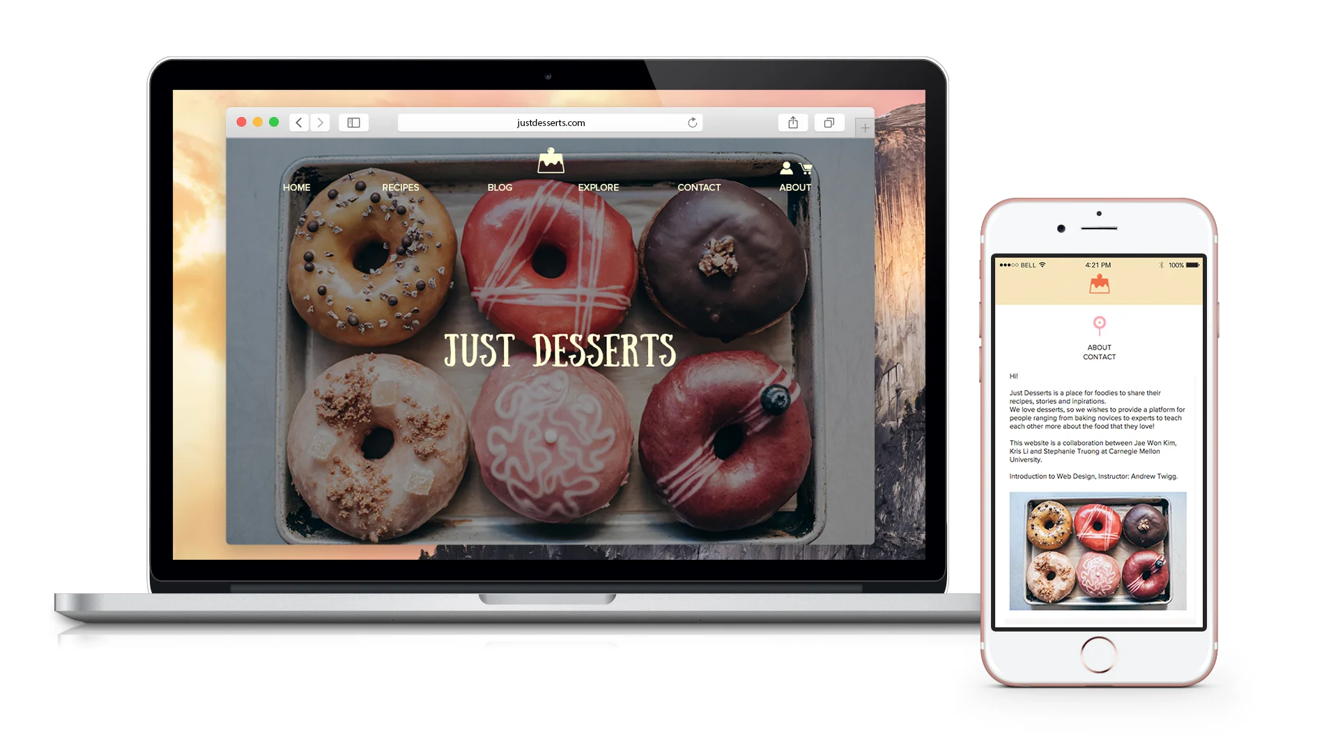 Just Desserts is a website platform for foodies to share their recipes, stories and inspirations. Our team created the responsive website from scratch, I was responsible for the visual design of the website, as well as the HTML/CSS for two interior pages and universal navigation.